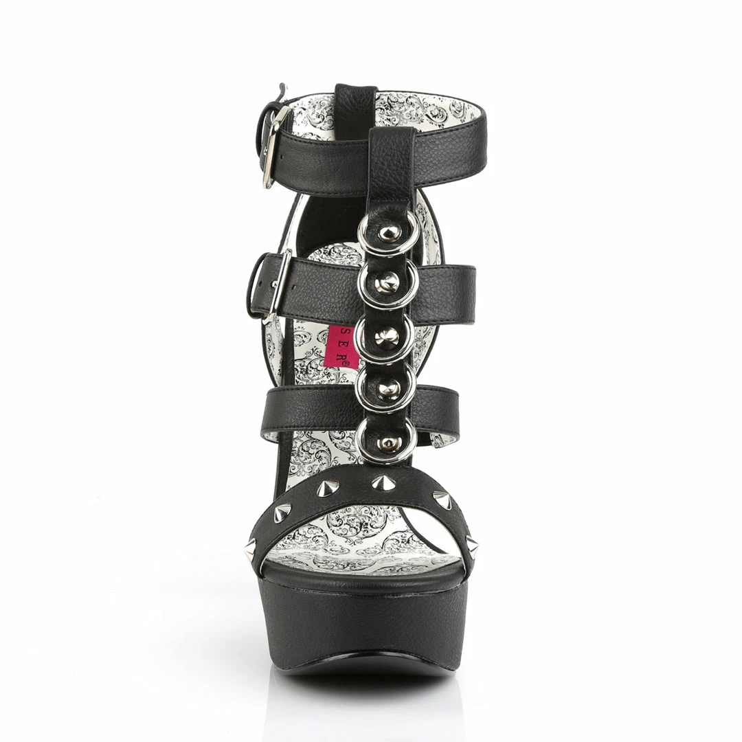 5 3/4″” (14.6cm) Heel, 1 3/4″” (4.5cm) Platform Strappy T-Strap Close Back Sandal with Metal Rings & Studs Detail