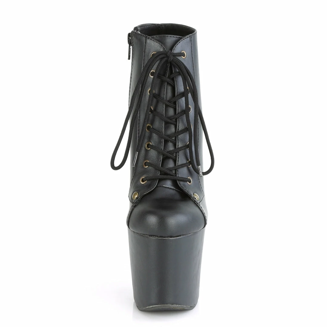 7″ (178mm) Heel, 3 1/4″ (83mm) Platform Lace-Up Front Ankle Bootie Featuring Fully Wrapped Platform and Stacked Heel, Inner Side Zip Closure