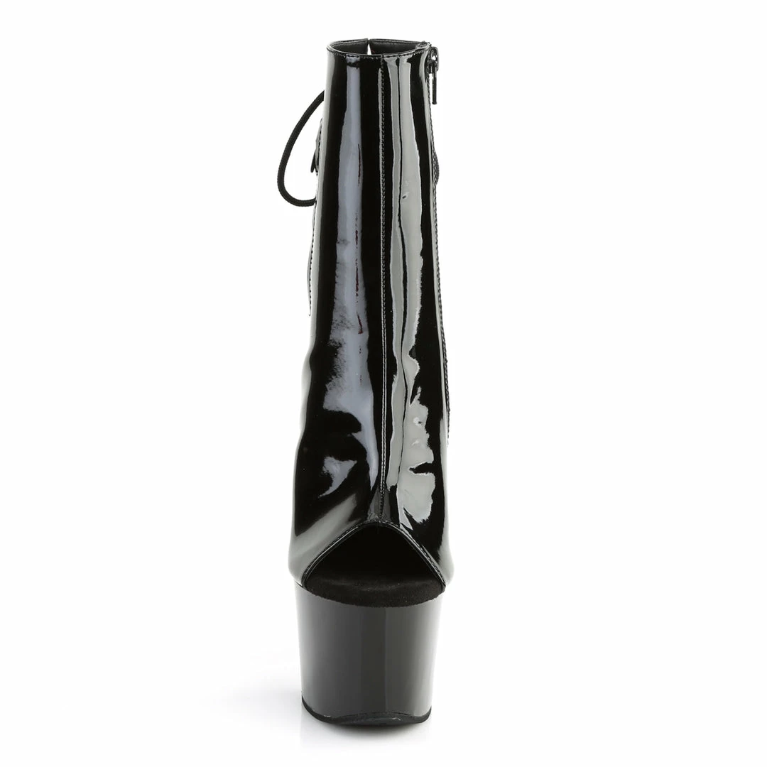 7″” (178mm) Heel, 2 3/4″” (70mm) Platform Open Toe/Heel Back Lace-Up Ankle Boot w/Hidden Zip Pocket, Inside Zip Closure