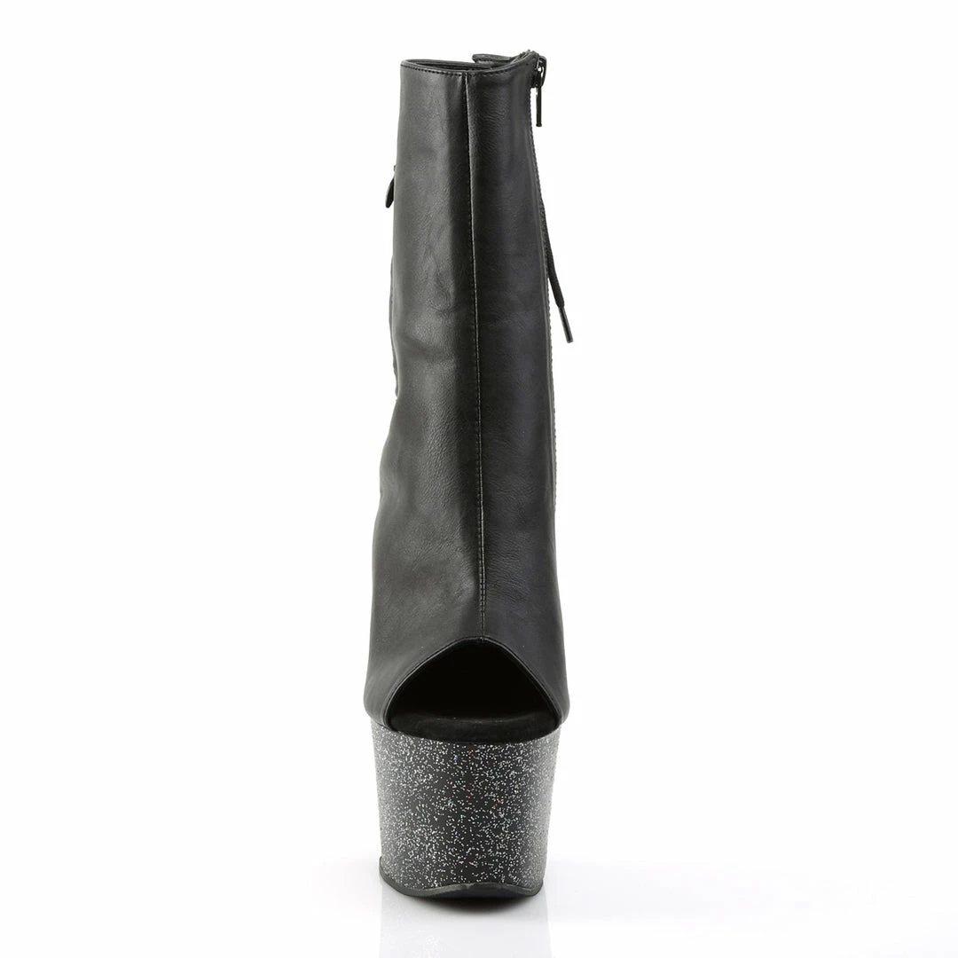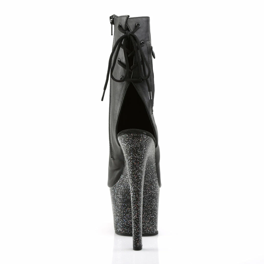 7″ (17.8cm) Heel, 2 3/4″ (7cm) Platform Open Toe/Heel Lace-Up Back Ankle Boot with Hidden Zip Pocket Featuring Mini Iridescent Glitter on Entire Bottom, Inside Zip Closure