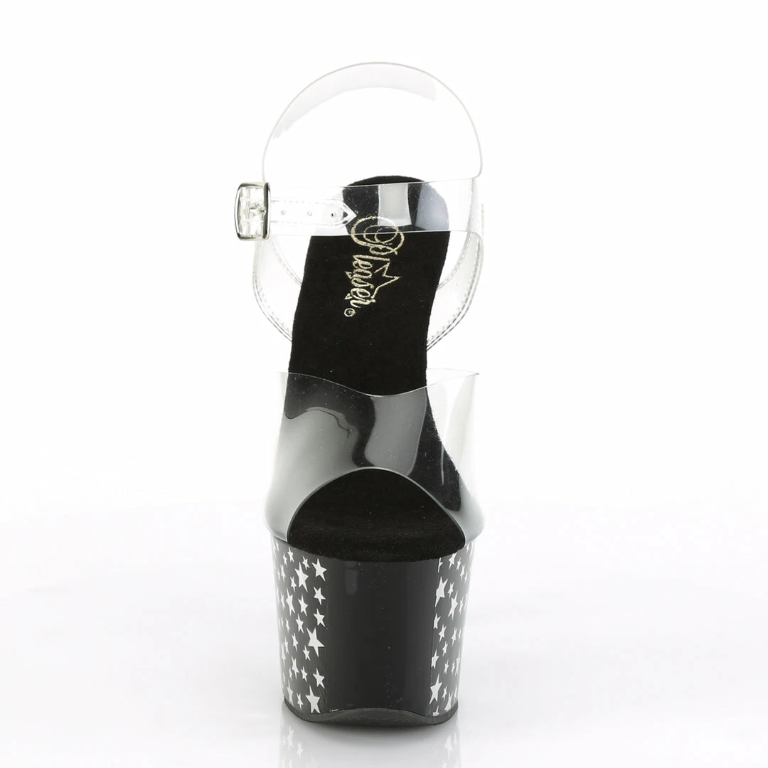 7″ (178mm) Heel,, 2 3/4″ (70mm) Platform Ankle Strap Sandal Featuring Chrome Stars on the Inner & Outer Sides of the Platform Bottom