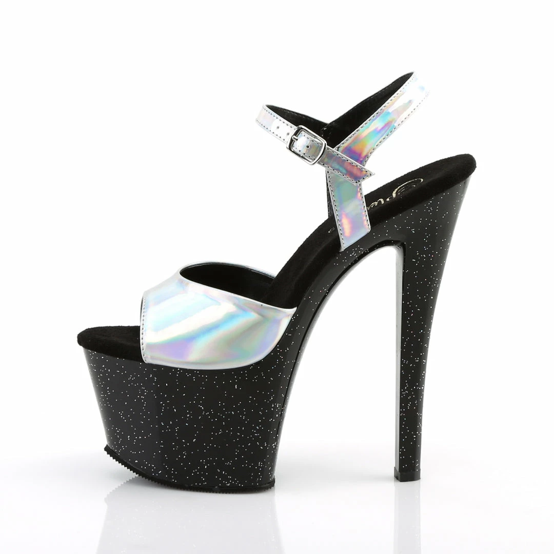 7″ (178mm) Heel, 2 3/4″ (70mm) Platform Ankle Strap Sandal Featuring Holographic Upper and Mini Iridescent Glitters on the Entire Platform Bottom